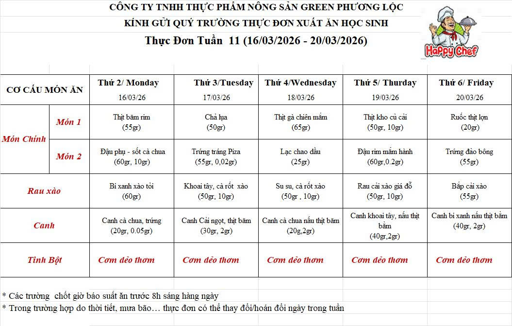 Thực đơn tuần 11 (16/3 đến 20/3/2026)