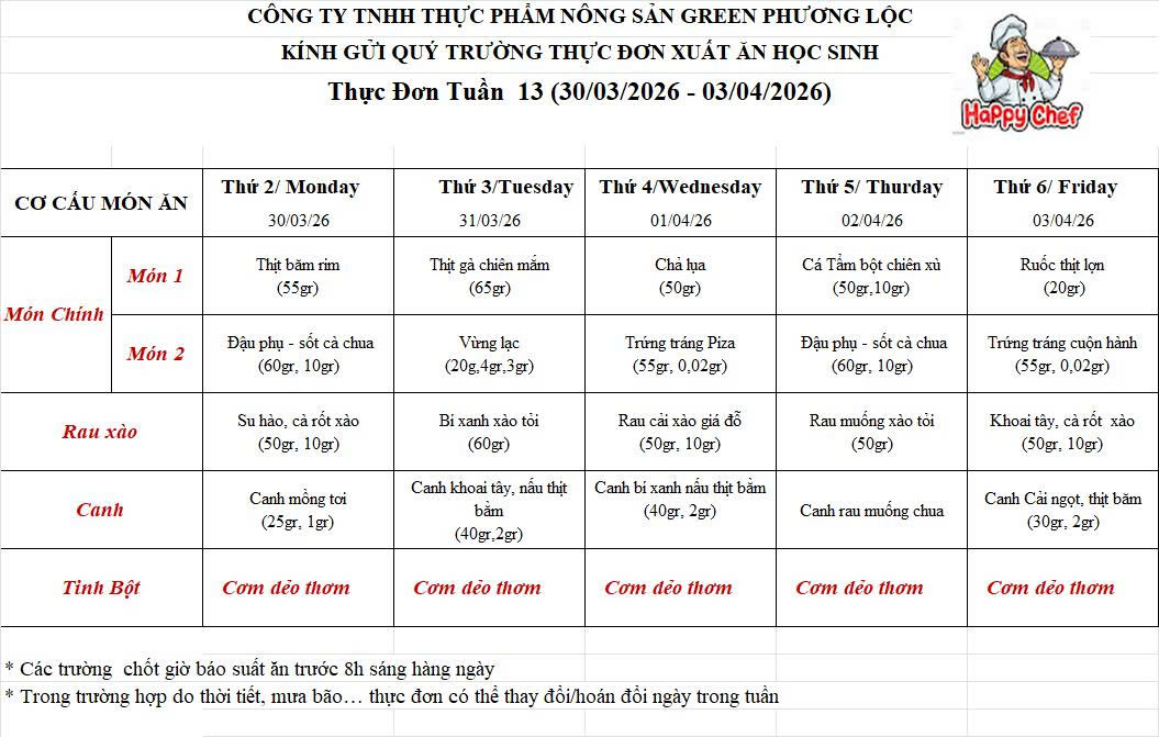 Thực đơn tuần 13 ( từ 30/3 đến 3/4/2026)