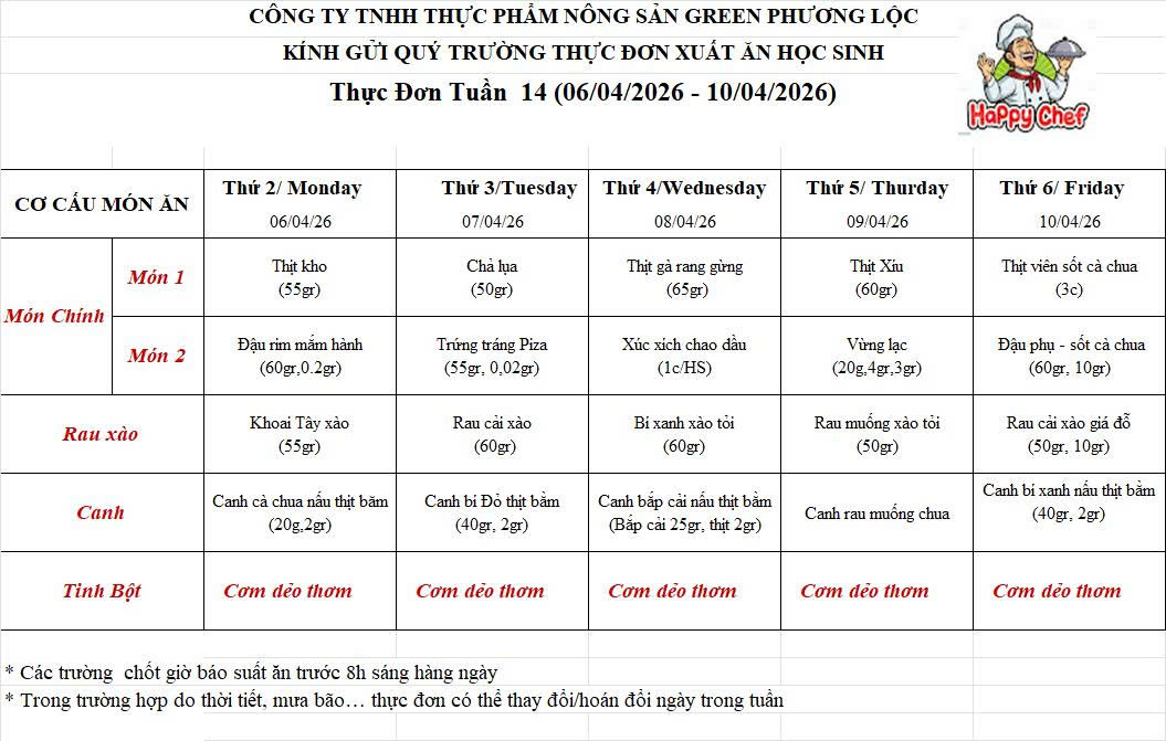 Thực đơn Tuần 14( 6/4-10/4)