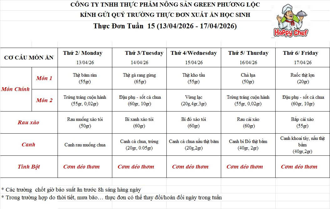 Thực đơn tuần 15 ( từ 13/4 đến 17/4/2026)