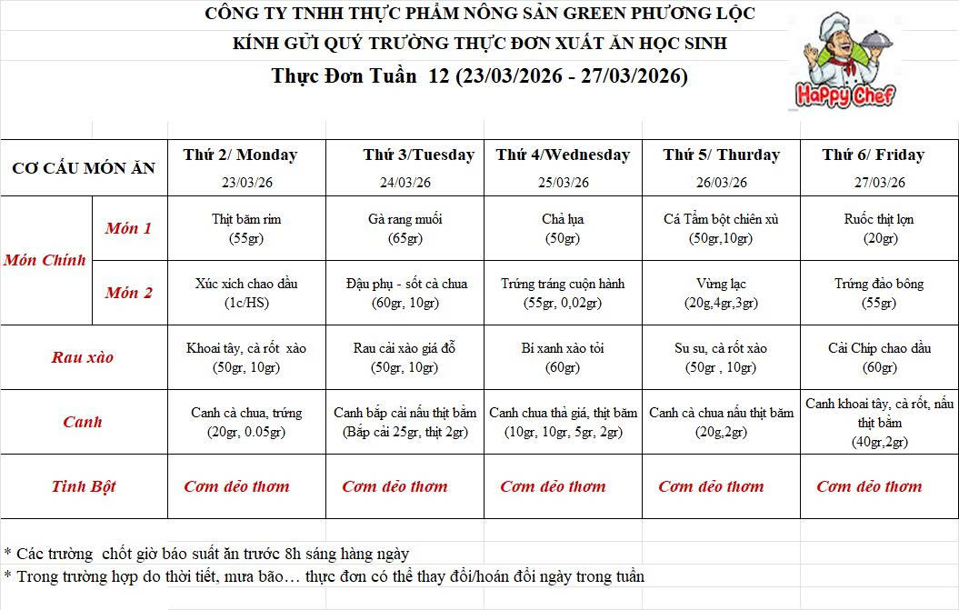 Thực đơn tuần 12 ( 23/3 – 27/3)